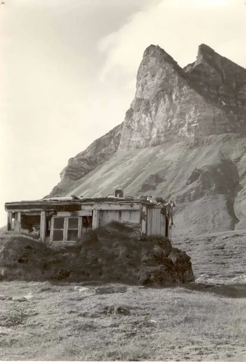 Derelict trapper’s cabin beneath Alkhornet. Photo: Norwegian Polar Institute