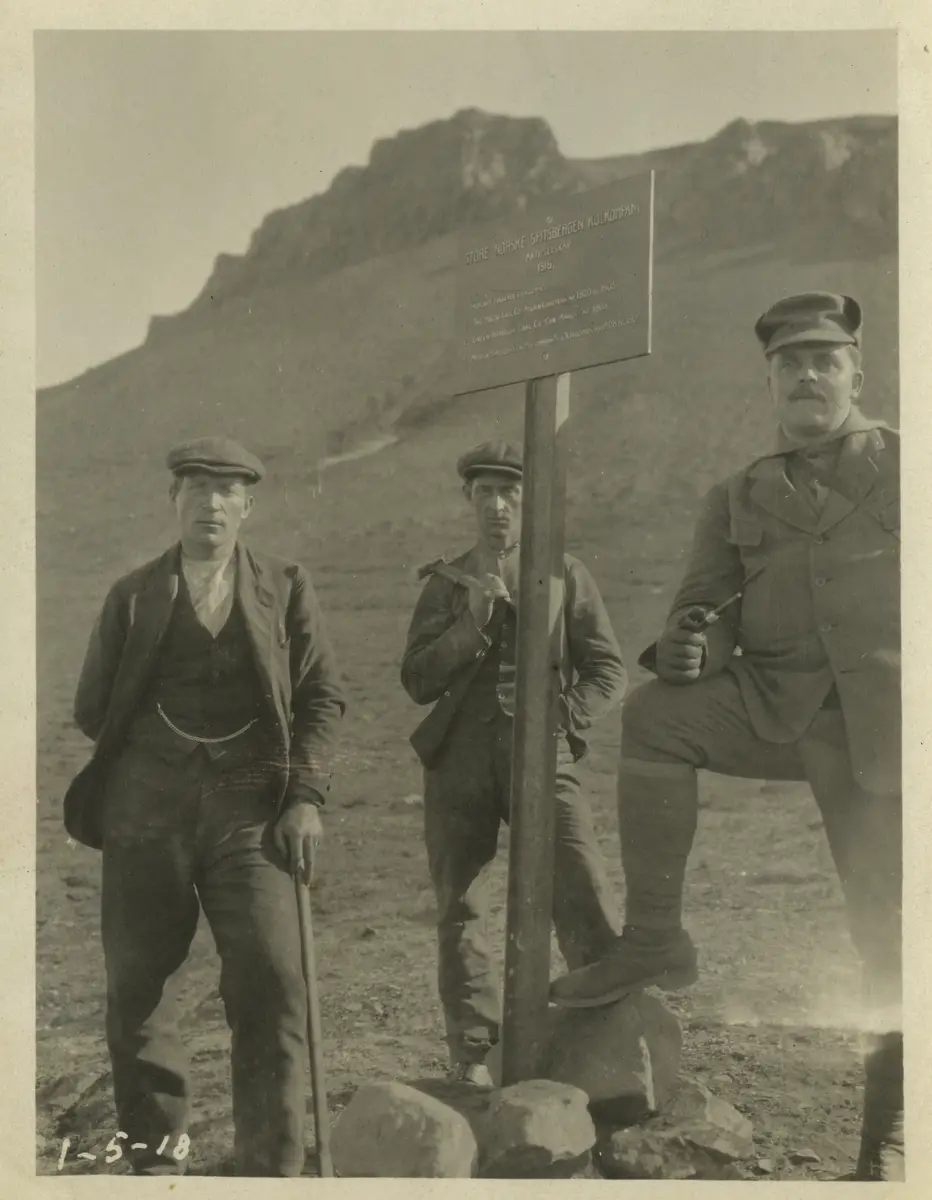 Three men next to Store Norske Spitsbergen Kulkompani AS' annexation sign in 1918. Svalbard museum