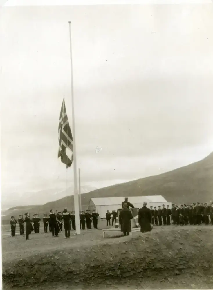 Fra overtakelsen av norsk suverenitet 14. august 1925. Flagget heises på Skjæringa. Foto: Sigurd Andreas Rasmussen, Svalbard museums samlinger SVF 18669